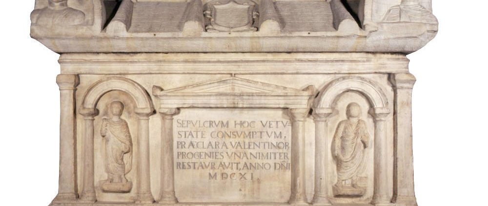 Sarcofago Valentini, a decorazione architettonica. Il coperchio, a forma di tetto displuviato, è munito di acroteri angolari. Fine II – inizi III secolo d.C. Riutilizzato intorno alla fine del III secolo d.C. da M. Aurelius Processanus, la cui iscrizione fu sostituita nel XVII secolo da quella dei Valentini ma è a noi nota dalla cronaca di Tommasino de’ Bianchi (Museo Lapidario Estense)