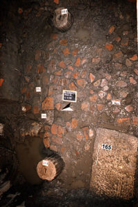 Scavo 1987-88. La pavimentazione in grandi frammenti di laterizi contemporanea o immediatamente successiva alla II fase. Copre tutte le sepolture ad eccezione della lastra 165 che chiudeva le tombe 23 e 24.