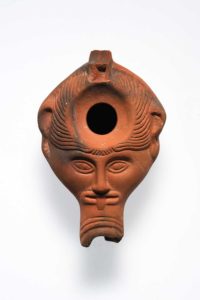 Lucerna con testa di sileno di probabile provenienza orientale, sul retro si trova un cartiglio predisposto per una iscrizione. I secolo a.C. Museo Civico Archeologico Etnologico di Modena.